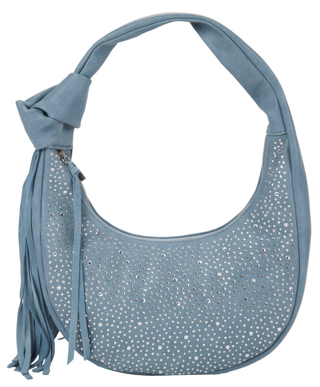 Introducing the Kylie Mini Bag, a chic accessory that combines style and functionality. This bag features a faux leather exterior adorned with sparkling rhinestone accents, a convenient shoulder strap, and playful fringe detail. The top zip compartment opens to a lined interior, perfect for your essentials. With bronze-toned hardware adding a touch of elegance, this bag measures 10 inches by 15 inches, making it the ideal size for any occasion.