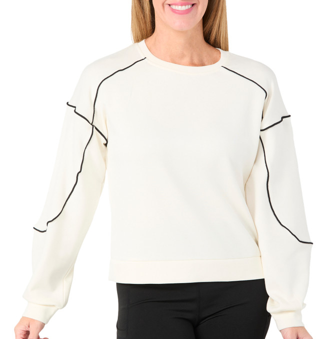 The Womens Scuba Contrast Piping Crew Sweater brings modern edge to cozy comfort. Designed with sleek scuba fabric and bold contrast piping, it delivers a stylish blend of structure and softness. Perfect for casual outings or relaxed weekends, this versatile sweater flatters every silhouette while adding a contemporary touch to everyday wardrobe essentials. Fabrication 50% rayon, 45% polyester, 5% spandex.