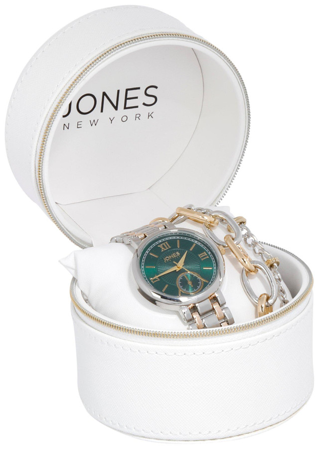 Elevate your accessory collection with the Jones New York Women's 3-Piece Boxed Watch Set. This chic set features a sleek watch paired with coordinating bracelets, all presented in a stylish gift-ready box. Perfect for adding a touch of sophistication to any outfit or as a thoughtful gift for a loved one. Whether dressing up for a special occasion or adding flair to everyday wear, this set offers versatility and timeless appeal.