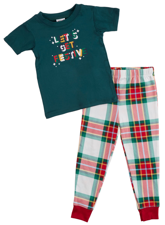 This little kids 2 piece Christmas pajama set features a solid green short sleeve crew neck top with the playful script Lets Get Festive. Coordinating holiday plaid pants with an elastic waistband complete the cozy and cheerful look, perfect for celebrating the season in comfort. Fabrication is 95% polyester and 5% spandex.