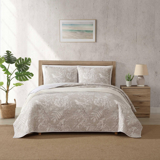 Our Tommy Bahama Jungle Toile Quilt Set draws inspiration from the vibrant jungle, showcasing a playful blend of birds and leaves against a neutral grey backdrop. It brings a touch of the outdoors into your space with its charming and versatile motif. Crafted from 100% cotton with 80% cotton, 20% polyester filling, the quilt is lightweight, easy to layer, and perfect for year-round comfort. The shams feature a two-piece back closure and a 2-inch self-flange. Eco-friendly packaging.
