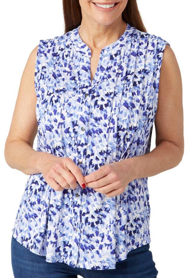 Elevate your wardrobe with this elegant Sleeveless Top, featuring a buttoned front that adds a touch of classic charm. The pleated details enhance the overall design, providing a sophisticated and flattering silhouette. Perfect for any occasion, this top can be paired with tailored pants for a polished look or with jeans for a more casual vibe. Fabrication is 96% polyester, 4% spandex.