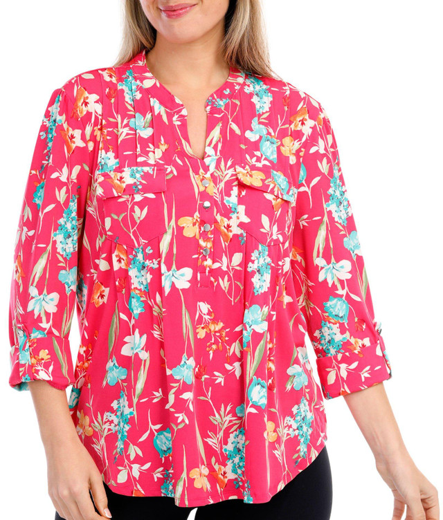 Introducing the Womens Floral 3/4 Sleeve Top, crafted from a blend of polyester and spandex for a comfortable and flexible fit. This stylish top features a charming floral print, a button-down placket, 3/4 length roll tab sleeves, pleated details, and chest pockets. Perfect as a work blouse, it combines practicality with a touch of elegance.