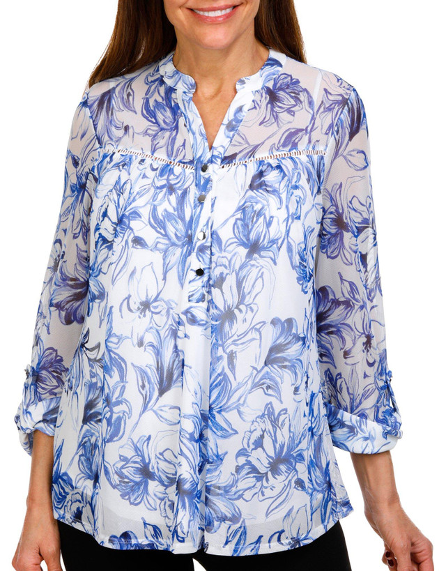 Discover the perfect blend of style and comfort with this bright 3/4 sleeve top! Adorned with a print design, this top is crafted from silky lightweight knit fabric, ensuring a luxurious feel. The V-neckline with a 4-button henley placket adds a touch of elegance, while the front pleat detail and roll tab sleeves offer a chic, versatile look. Front length is approximately 25 in. Fabrication is 95% polyester and 5% spandex.
