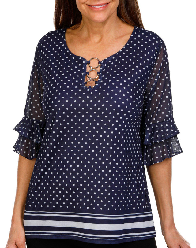 Add a splash of color to your wardrobe with our Short Flutter Sleeve Top. This vibrant piece features a colorful print design that is sure to turn heads. Crafted from mesh fabric with a built-in liner, it offers both comfort and style. The triple O-ring split neckline detail adds a unique and modern touch, making this top perfect for any occasion. Embrace a blend of elegance and playfulness with this standout piece. Fabrication is 95% polyester and 5% spandex.