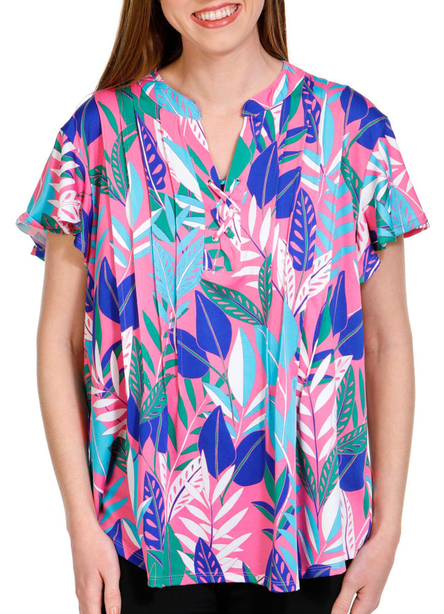 Introducing our Women's Short Sleeve Floral Lace Up Top, crafted from a blend of polyester and spandex for a comfortable and flexible fit. This top features a vibrant multicolored leaf design, pleated details, and a unique lace-up collar. Perfect for work, it combines professional elegance with a touch of playful style, making it a versatile addition to your wardrobe.