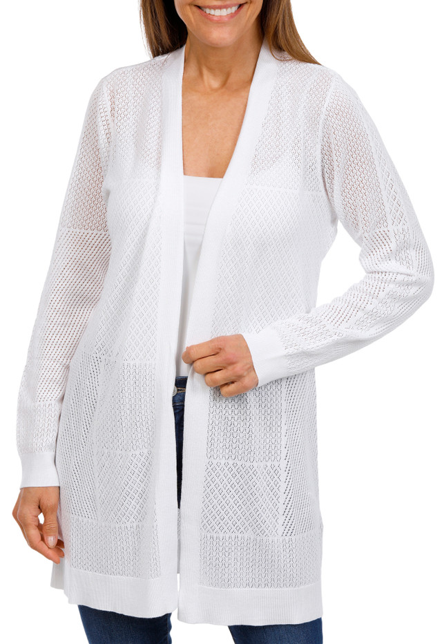 The Womens Patchwork Pointelle Open Cardigan adds texture and effortless layering to any outfit. Designed in a solid color, it features an airy open-knit pointelle pattern that offers lightweight warmth and visual interest. The open-front silhouette creates an easy, relaxed fit, making this cardigan perfect for casual layering year-round. Cardigan length measures approximately 30 in. Fabrication 78% polyester, 22% spandex.