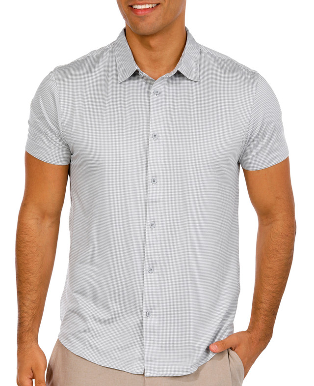 Stay effortlessly comfortable with the Mens Short Sleeve Button Down Knit Shirt which features a super soft yarn dyed knit fabric with a subtle checkered print and a relaxed button down front for easy style. The loose fit allows for breathable all day wear, perfect for casual outings or layering. Fabrication is 95% polyester 5% spandex. Length measures approximately 29 in.