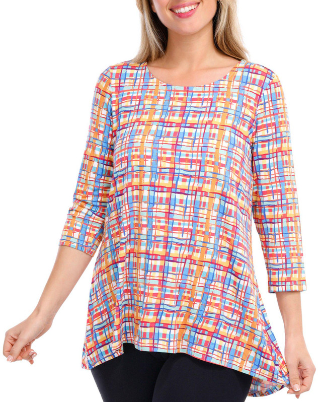 Introducing our Women's Print Legging Tee, designed for both style and performance. This tee features a vibrant multicolored print, a round neckline, and 3/4 sleeves for a chic look. Made from a blend of rayon and spandex, it offers a comfortable fit with performance stretch, perfect for activities like yoga and more.