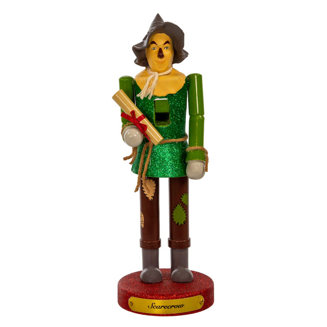 The 10-inch Wizard of Oz Scarecrow Nutcracker is a beautiful addition to any holiday decor or nutcracker collection. Perfect for Wizard of Oz fans and collectors, the Scarecrow is featured here in a green glittered top with tattered pants with accessories and details that make him special and unmistakable. He is wearing a rope belt and a scroll in one hand.
