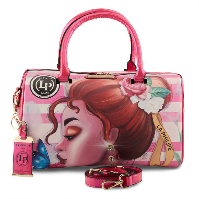 Turn heads with the Pink in Beauty Satchel Handbag, a celebration of bold femininity and artistic elegance. With a striking hot-pink-on-light-pink design, it features a mesmerizing portrait of a woman with a butterfly delicately resting on her face, symbolizing transformation and beauty. Crafted from 100% premium PU leather, it is the perfect balance of luxury and practicality. Measurements: handbag 13 in. x 7.5 in. x 8 in., drop 6 in., shoulder strap 20-23 in.