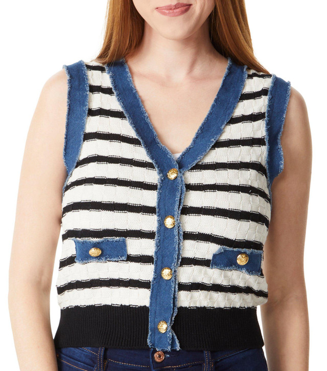 Introducing the Women's Striped Pointelle Denim Trim Vest, crafted from a comfortable blend of polyester and cotton. This stylish vest features a chic striped print, faux pockets adorned with gold buttons, and a classic button-down front. The denim trim adds a touch of casual elegance, making it perfect for layering over your favorite tops. Ideal for both casual and dressy occasions, this versatile vest is a must-have addition to your wardrobe.