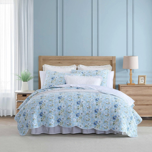 The Laura Ashley Peony Garden Reversible Quilt Set is a harmonious blend of timeless elegance and botanical beauty. It features a delightful all-over floral print in shades of blue and green, set against a soothing dusty blue ground. The midweight quilt and shams are adorned with a charming scallop edge. Made from high-quality cotton materials, the peony garden quilt set is both soft and durable. Machine washable for easy care. Fabrication 100% cotton.