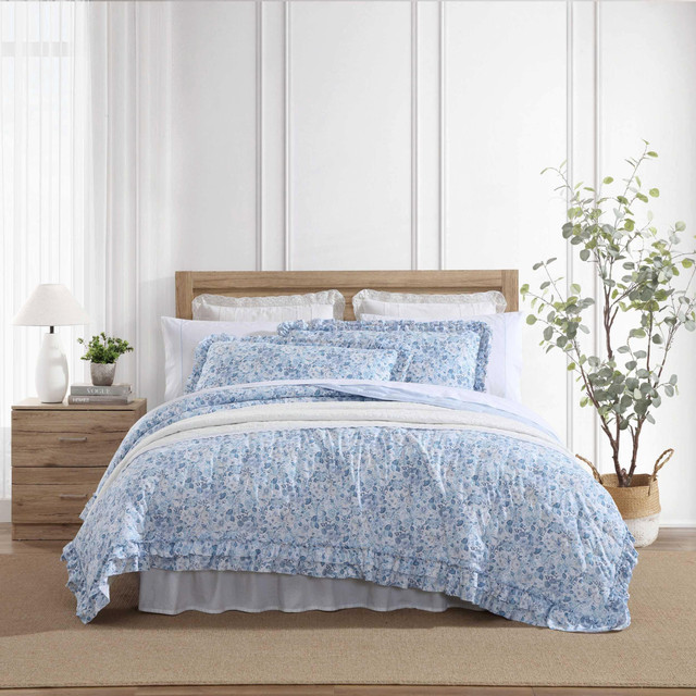 The new Laura Ashley Quartet Microfiber Reversible Quilt Set is the perfect combination of style and comfort. Made from the highest quality microfiber, it is incredibly soft to the touch and will keep you cozy all night long. The quilt features an elegant, embroidered dot pick stitch and a 2 in. double ruffle embellishment, adding a touch of sophistication and femininity to the design. Machine washable for easy care. Fabrication 100% polyester..
