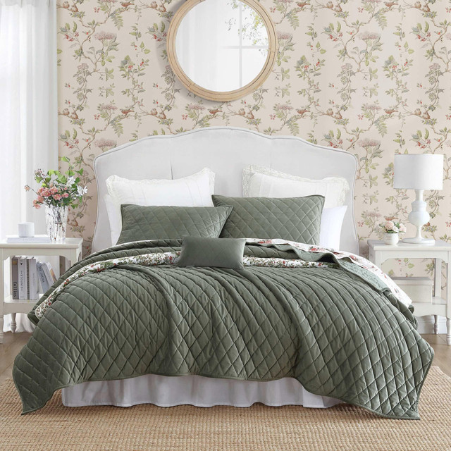 The Laura Ashley Solid Diamond Stitch Reversible Quilt Set features sumptuous plush velvet with a classic diamond stitch for an elegant statement. The dark green color is timeless, and velvet adds a romantic touch. As a layer or stand-alone, this set is a versatile addition that can be used year-round. Includes a bonus pillow cover (12 in. x 20 in.). Machine washable for easy care. Fabrication 100% polyester.