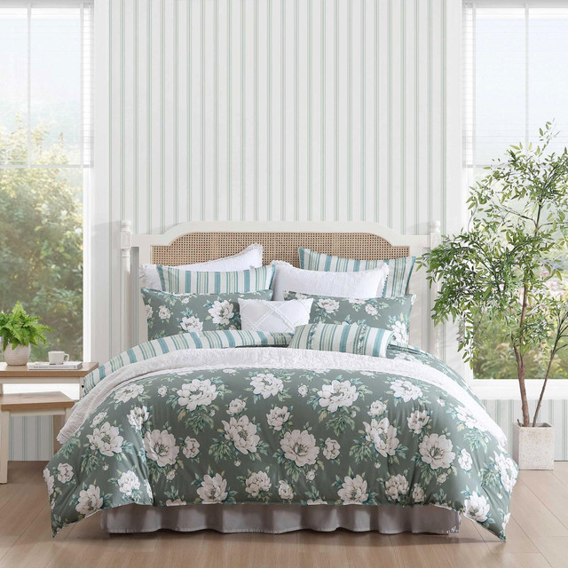 The Laura Ashley Wisley Floral Comforter Set is a beautiful, charming addition to any bedroom. Featuring a classic floral design with a touch of contemporary elegance, the sage green creates a serene and inviting atmosphere, making it easy to coordinate with various room décors and accessories. Coordinating decorative pillow covers are added to the set to complete the look. The comforter reverses a coordinating ticking stripe pattern. Machine washable for easy care and maintenance.