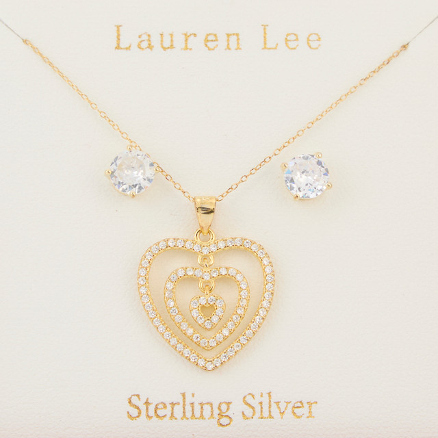Shine with timeless elegance in the Lauren Lee Gold Sterling Round CZ Boxed Earring and Heart Necklace Set. This set features round cubic zirconia stud earrings and a gold tone on sterling silver chain necklace with a heart pendant with pave CZ stones. Perfect for adding a touch of sparkle to any outfit, it makes a thoughtful gift or a stylish addition to your own jewelry collection.