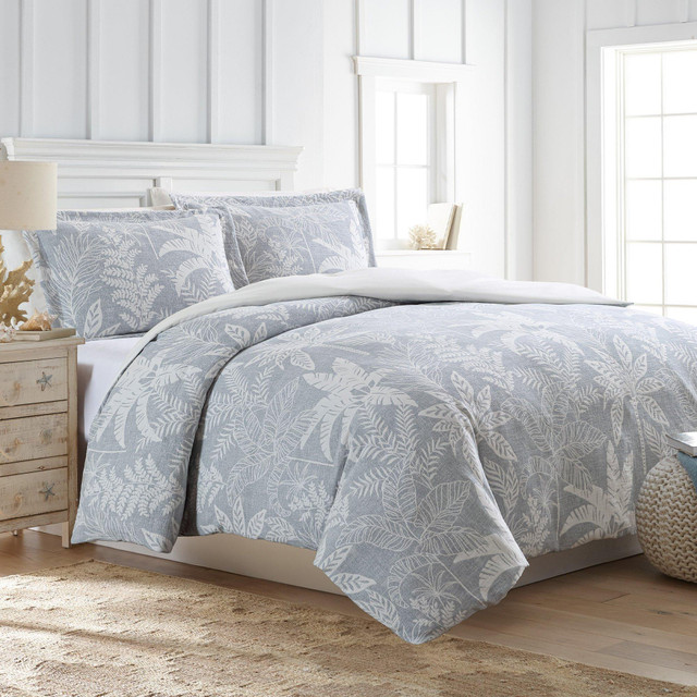 The Seaside Palms Comforter Set by Levtex Home is calming and modern. Offered in blue, this design will immediately transform your bedroom. Made with a soft, luxurious cotton, this comforter set features a woven jacquard with tropical design in blues. It has a solid blue 100% cotton on the reverse. It is filled with a hypoallergenic 100% polyester filler. The Seaside Palms Comforter Set is machine washable. Enjoy this for years to come!