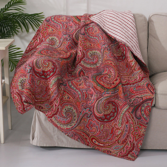 The Spruce Red Reversible Quilted Throw by Levtex Home brings bold bohemian charm to your space. Featuring rich paisleys in burgundy, red, tan, and grey, it reverses to a classic red stripe for a versatile look. Made from soft, lightweight cotton with a cozy cotton-rich fill, its perfect for layering warmth and style. Machine washable for everyday ease. Measures 50 in. x 60 in.