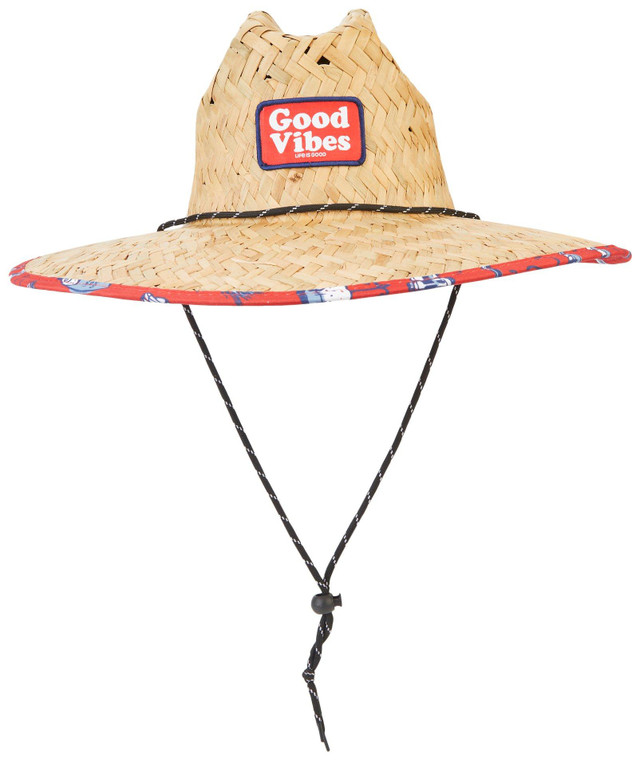 This Straw Hat features a 100% straw woven construction, a front Good Vibes script, a pinched crown, a wide brim, an interior stretch sweatband, and an adjustable chin strap. Brim measures approximately 4.5 in.