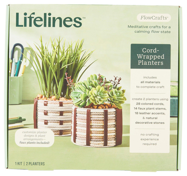 Promote focus and creative expression with the FlowCrafts Cord Wrapped Planters kit designed to help you create two custom planters. Kit includes: 28 colored cords with 18 leather accents for 2 included bases, 14 faux plant stems and natural decorative stones. A calming craft that brings a touch of nature to any space.
