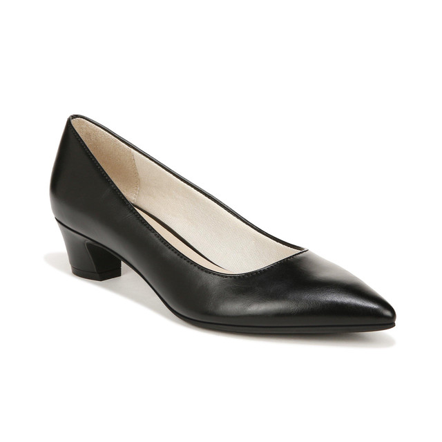 True elegance. Let this pointed dress heel take you where you want to go. Beautifully designed upper with a pointed toe, slip-on fit, and tapered block heel. Insole board, linings, toe box and heel counter partially crafted with recycled materials. Soft System® comfort package provides all-day support, flex, and cushioning. Traction platform sole provides you with extra stability. Just Right Height 1 and 1/2 inch block heel.