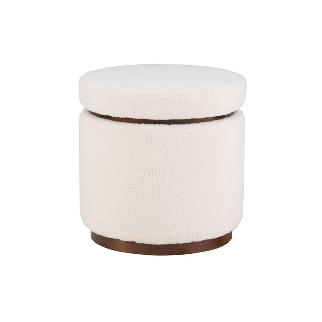 Versatility, comfort and style come together in this best-selling storage ottoman. Perfect for tucking away blankets, magazines and electronics, it also doubles as a comfortable footrest or extra seating. Soft natural sherpa fabric covers the side panels and removable lid, while the interior space is fully lined with black felt. Pinewood trim provides an eye catching contrast adding to the refined nature of the piece. Measures 13.75 in. W x 13.75 in. D x 13.75 in. H.