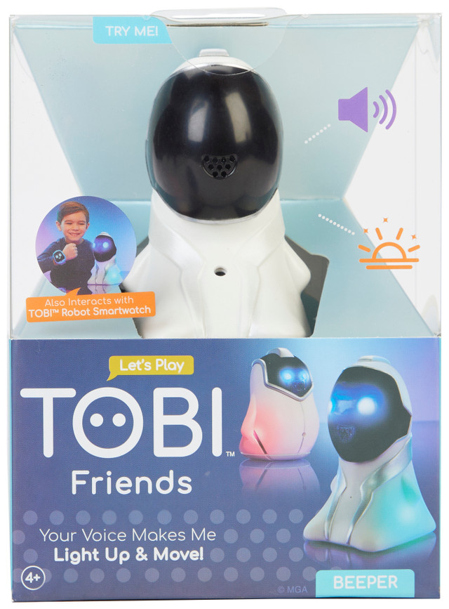 Spark excitement with the Tobi Friends Beeper Toy, a responsive companion that lights up and moves with the sound of your voice. Featuring glowing LED lights, playful motion, it interacts with the Tobi Robot Smartwatch and other Tobi Friends for dynamic group play. Requires 6 AG13 batteries (included). Perfect for encouraging interactive and imaginative fun. For ages 4 years and up.