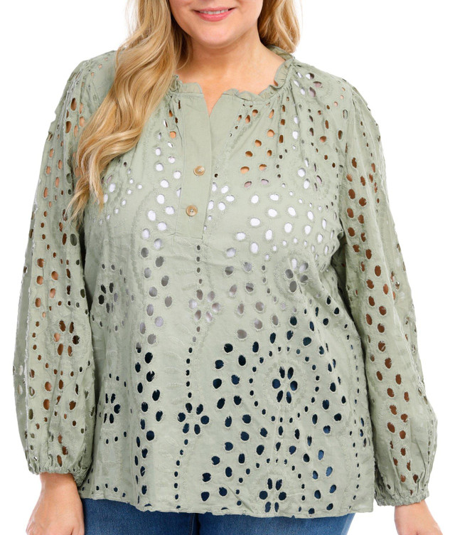 Add a touch of elegance to your wardrobe with this Long Sleeve Top, featuring a stylish buttoned neck and all-over open eyelet details. The elastic cuffs provide a comfortable fit while adding a hint of sophistication. Perfect for both casual and dressy occasions, this top pairs beautifully with jeans, skirts, or trousers.