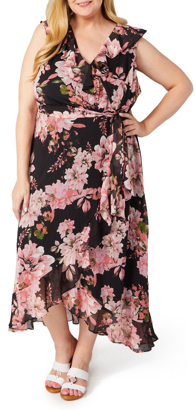 Elevate your style with this Sleeveless Maxi Dress. Crafted from airy chiffon fabric and adorned with elegant ruffle details, this dress features a captivating floral print that exudes charm. The zipped back ensures a secure fit, while the waist tie detail allows for a flattering silhouette. The hanky hem adds a unique touch, making it perfect for any occasion.