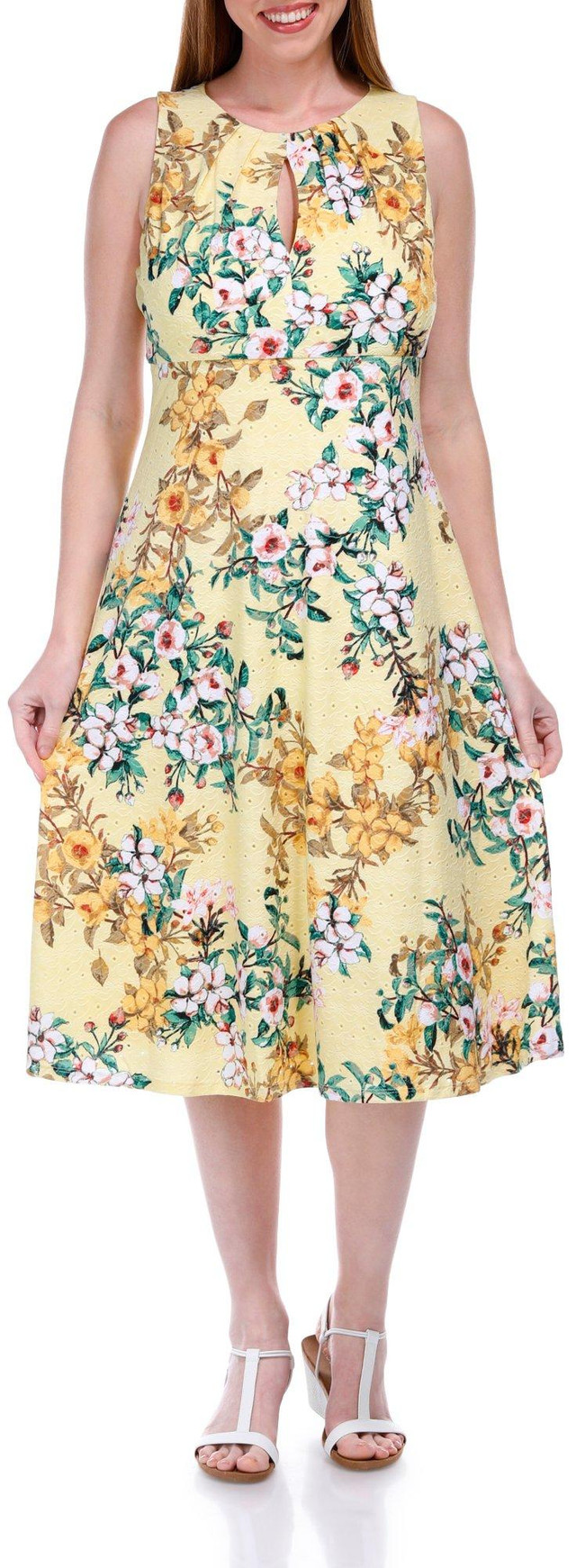 The Sleeveless Midi Dress is a perfect blend of elegance and comfort. Featuring a zipped back for easy wear, this dress is crafted from eyelet jersey fabric, offering a unique texture and breathable feel. The print pattern adds a touch of charm and visual interest, making it ideal for both casual and dressy occasions. Whether paired with sandals or heels, this versatile dress ensures you look effortlessly chic. Fabrication is 95% polyester, 5% spandex.