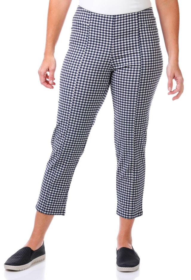 Add a touch of classic charm with these gingham capris. Made from a comfortable blend of 69% rayon, 14% polyester, 13% nylon, and 4% spandex, they offer a soft feel with just the right amount of stretch. Featuring a 25-inch inseam and a comfort waist, theyre perfect for all-day wear. Machine wash and tumble dry for easy care.