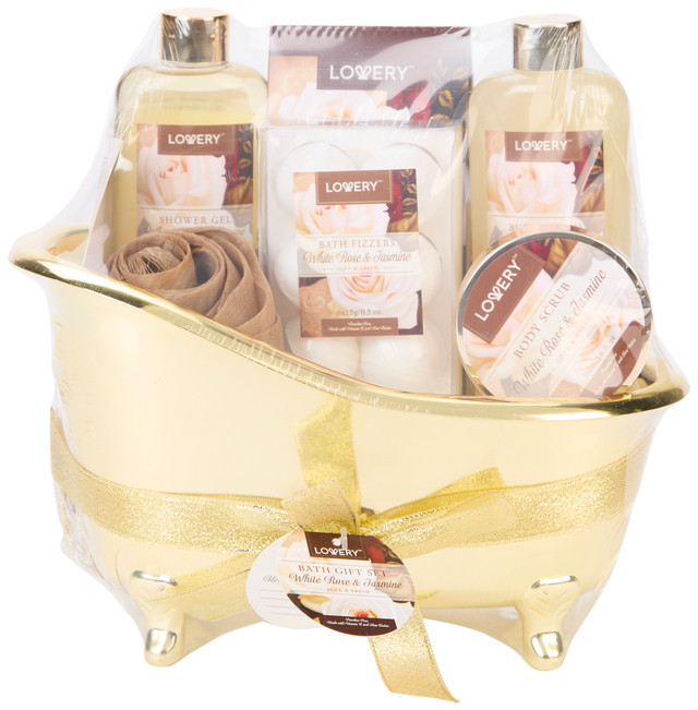 Pamper yourself with our 8-Piece White Rose Jasmine Bath Set. Includes shower gel, bubble bath, body scrub, bath salts, fizzers, bath puff, travel bag, and a gold foil tub holder. Perfect for creating a relaxing spa-like experience at home or gifting someone special.