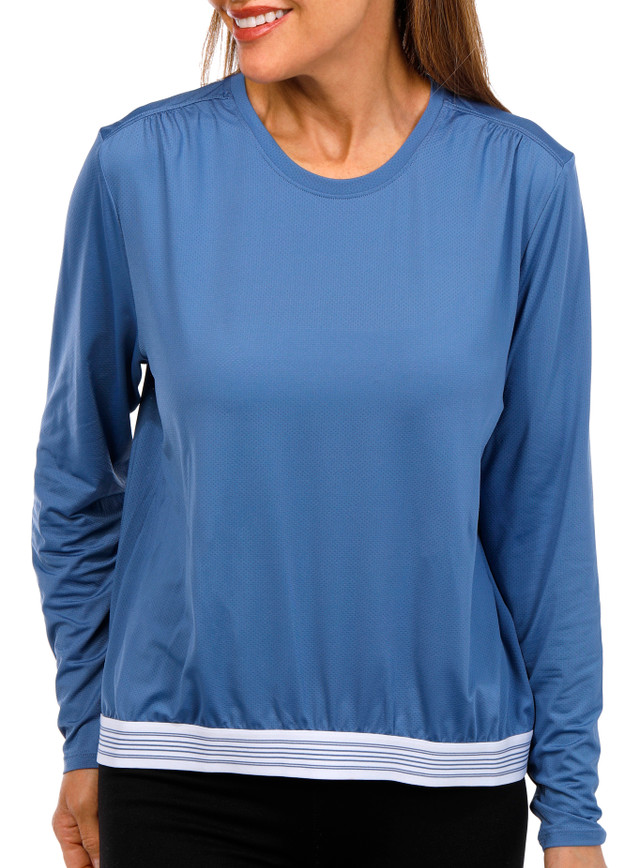 Stay cool and confident in the Womens Golf Long Sleeve Baseline Pullover Top, designed for easy movement and modern athletic style. Textured solid color fabric with a striped banded hem adds visual interest, while the crew neckline, shoulder ruching, and long sleeves create a sleek flattering silhouette. Moisture wicking, quick dry fabric keeps you comfortable for golf, tennis or everyday wear. Fabrication is 92% nylon 8% spandex. Length measures approximately 23 in.