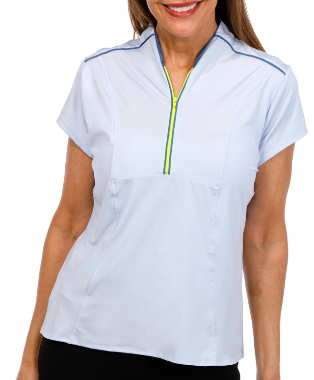 Stay cool and confident on the course with the Womens Golf Short Sleeve Swing 1/4 Zip Top, designed for easy movement and standout style. A chic solid color with contrast color piping and accents, split neckline with 1/4 zip placket, and short sleeve cut elevate the look, while moisture wicking, quick dry fabric keeps you comfortable. Perfect for golf, tennis or everyday wear. Fabrication is 88% polyester 12% lycra. Length measures approximately 24 in.