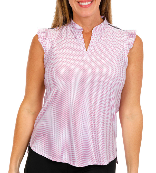 Stay cool and confident on the course with the Womens Golf Sleeveless Berry Sweet Tank Top, designed for easy movement and standout style. A chic print, split neckline, and ruffled sleeveless cut elevate the look, while moisture wicking, quick dry fabric keeps you comfortable. Mesh shoulder inserts and a side split hem add breathability. Perfect for golf tennis or everyday wear. Fabrication is 88% polyester 12% lycra. Length measures approximately 24 in.