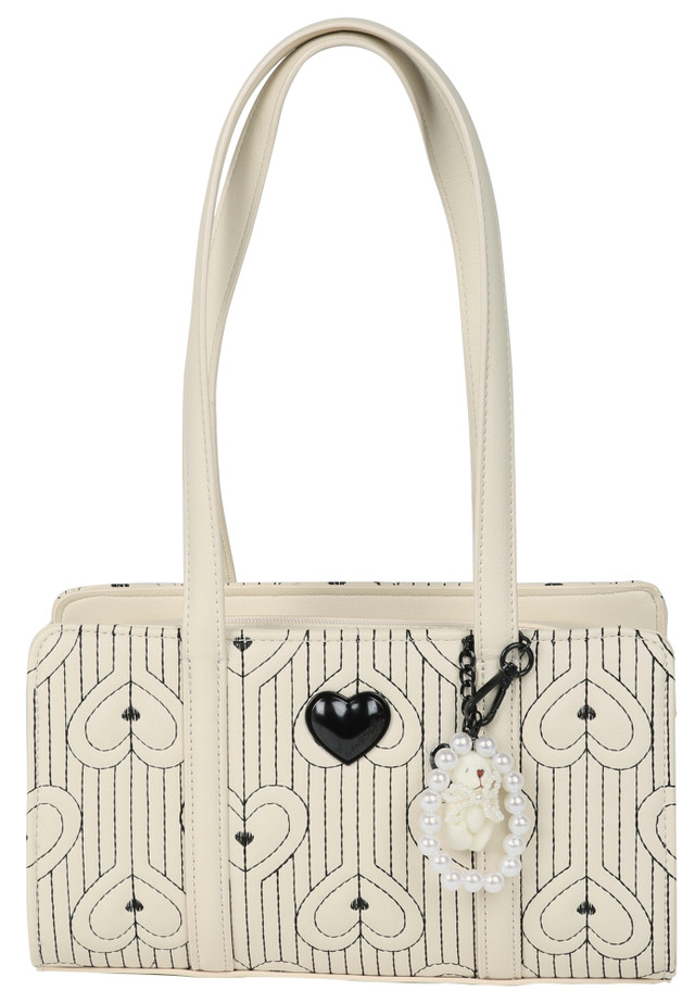 East/West shoulder bag is a fun and fashionable everyday accessory with a playful twist. It features an embroidered heart design, top handles, and removable faux peal bag chain with bear. The shoulder straps are sized for comfortable daily wear, and the zip-top closure opens to a lined interior with enough space for your essentials, such as wallet, phone, keys, and makeup. Measures 11 in x 5 in x 7 in