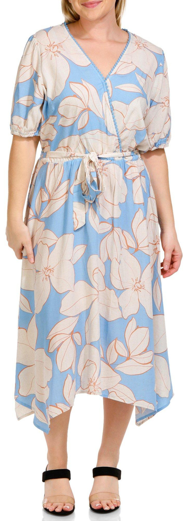Introducing our Women's Floral Surplice Dress, crafted from a blend of linen and rayon for a lightweight, breathable feel. This dress features a stylish floral design, a deep V-neckline, and a flattering wrap design with a waist tie. The short sleeves add a touch of elegance, while the 43-inch length provides a graceful silhouette. Perfect for any occasion, this dress combines comfort and style effortlessly.