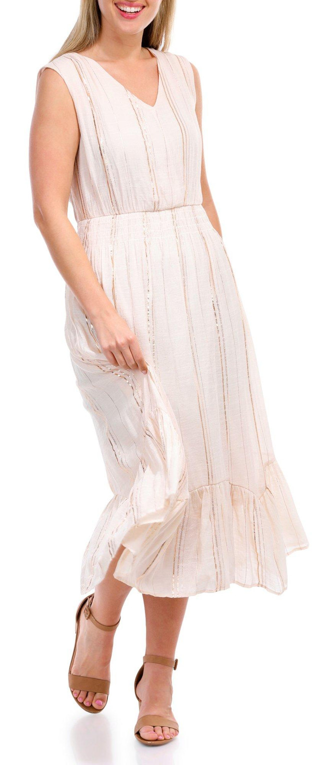 Introducing our Women's Foil Stripe Sleeveless Dress, crafted from a blend of rayon and polyester for a comfortable and elegant fit. This stylish dress features a chic foil stripe print, a flattering v-neckline, and a smocked waistband for added shape. With a 45-inch length, it offers a sophisticated silhouette perfect for any occasion. Embrace the season with this versatile and fashionable addition to your wardrobe!