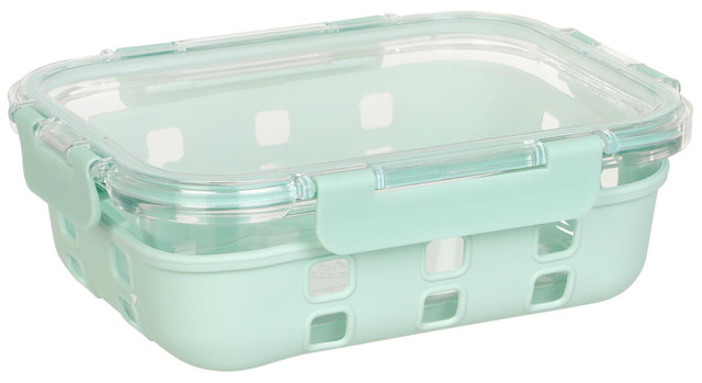 This is a reusable storage container to store ingredients or take meals on the go. It is made from stain resistant borosilicate glass that is durable and easy to clean. The no-slip, silicone sleeve protects it from chipping and breakage, and the snap-on lid helps prevent leaks and keeps food fresh. Capacity is 35 OZ.