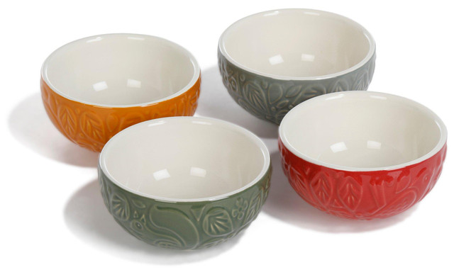 Add charm to kitchen prep or serving with the 4 Pack In The Forest Mini Bowls. Each features a floral embossed exterior in green or rust red with a clean white interior, blending function with decorative appeal. Ideal for spices, snacks or small portions. Fabrication is 100% ceramic. Each measures approximately 2 in x 4 in round.