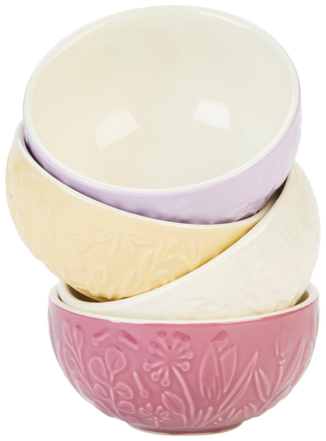 This set is intricately embossed with delicate florals and foliage with a beautiful pastel color palette. These stoneware bowls are perfect for storing ingredients for food prep, as well as dip or dessert dishes.
