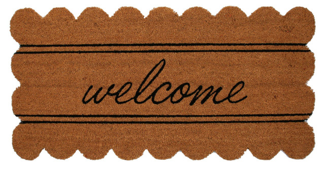 Welcome guests in style with the 20x40 Trevor Welcome Door Mat. Made from 100% coir, this durable mat features elegant scalloped edges and a charming cursive Welcome script. Perfect for adding a touch of sophistication to your entryway while keeping dirt at bay.