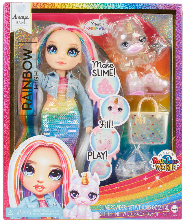 Create bold looks with the Girls Classic Rainbow World Fashion Amaya Raine Doll, styled in a sequin dress and jacket with signature rainbow striped hair. Includes a Rainbowie unicorn pet, slime, and glitter for fashion and pet customization using liquid rainbow sparkle slime. Encourages self expression through imaginative play. For children ages 4 years and up.