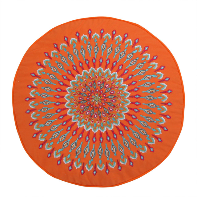 The Orange Peacock Round decorative pillow matches perfectly with the Levtex Home Mirage bedding collection. This pillow is sized at 18in. round and features an embroidered peacock medallion pattern on a bright orange ground. The fun color palette makes this a versatile accessory for your bed, couch or favorite chair. The pillows comes pre-filled with a soft, luxurious feather inner.