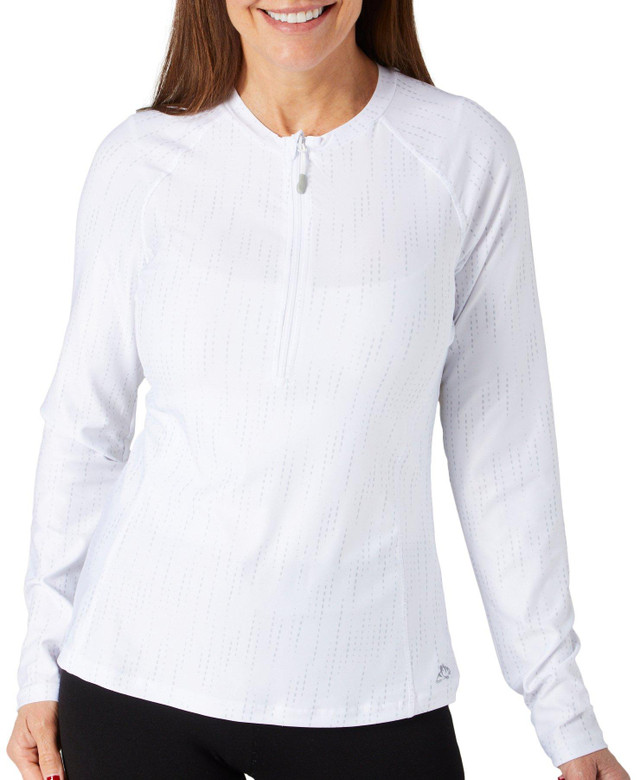 The Women's Active Printed 1/4 Zip Top combines style and performance with a comfortable, stretchy fit. Made from 92% polyester and 8% spandex, it offers breathability and flexibility for active days. The long sleeves provide coverage, while the 1/4 zip allows for adjustable ventilation. The vibrant print adds a stylish touch, making this top perfect for workouts, casual wear, or outdoor activities.
