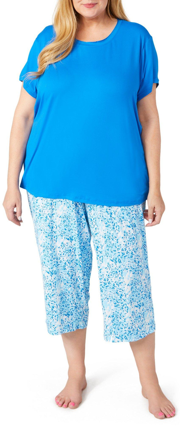 Introducing the Plus 2 Pc Capri Sleepwear Set, crafted from a comfortable blend of polyester and spandex. This set features a solid short sleeve top paired with leopard print capri pants, offering both style and ease. Perfect for lounging or sleeping, this set combines beauty and comfort, making it a delightful addition to your sleepwear collection.