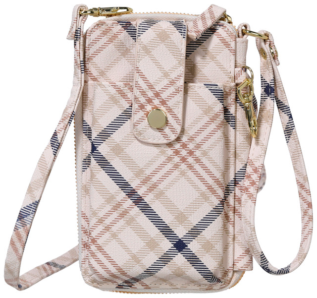 This bag features a lewis plaid print design on a vegan leather fabric, one exterior front snap cell pocket, a wristlet strap, a removable crossbody strap, and a zip around closure. The lined interior contains one zipper pocket, two slip pockets, one ID window, and 6 credit card slots total. Measures approximately 4.5 in x 7 in x 1.5 in.