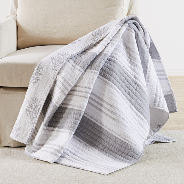The Nantucket Reversible Quilted Throw by Levtex Home is inspired by a relaxing seaside vacation. This white and grey design will immediately transform your bedroom. Made with the softest lightweight cotton, this reversible throw features a simple stripe design in grey & white, reversing to a coral tossed in grey color on a white ground on the other. The Quilted Throw is perfectly sized at (50x60in.) and is machine washable. Enjoy for years to come!