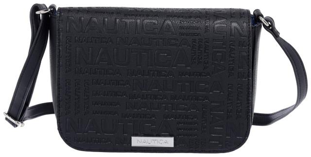 Introducing the Logo Flap Crossbody Bag, featuring a sleek faux leather exterior and embossed brand script on the front flap closure. This stylish bag includes silver-tone hardware and an adjustable crossbody strap for a perfect fit. The back slip pocket and lined interior with a zip pocket offer convenient storage options. Measuring 8 inches by 6 inches, this bag is both functional and fashionable, making it an ideal accessory for any occasion.